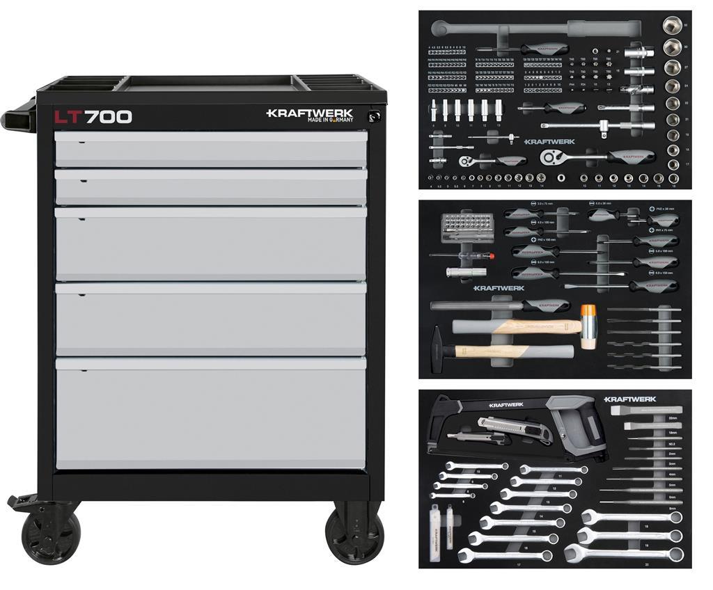 Limited edition zwarte gereedschapswagen met kunststof werkblad voorzien van 5 laden waarvan 3 gevuld met een 259 delig gereedschapassortiment in zachte schuiminlays. In Duitsland gefabriceerde, zeer stevige gereedschapswagen geconstrueerd uit dubbelwandig plaatstaal.
