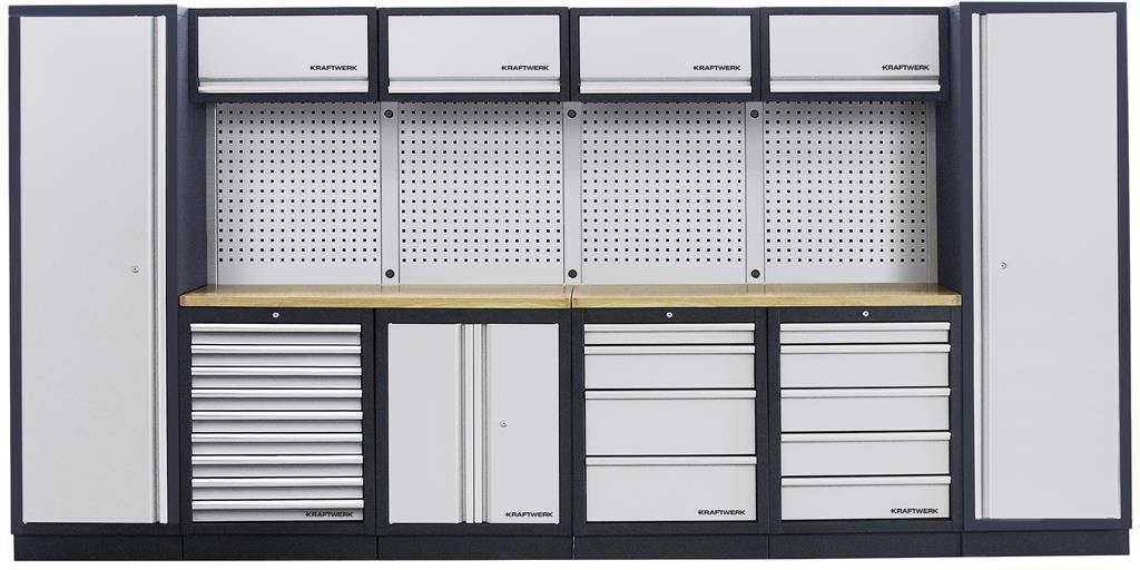 Het werkplaatskast- en werkpleksysteem van Kraftwerk is het ultieme modulaire systeem om uw werkplaats of garage volledig naar uw eigen behoeften in te richten, wat de productiviteit en efficiency verhoogt. Elke module kan afzonderlijk besteld worden. Alle laden hebben een individuele vergrendeling en zijn centraal afsluitbaar. De gereedschapswanden zijn voorzien van de standaard Euro perforatie. De 35 mm multiplex werkbladen zijn gemaakt van het beste berkenhout, bewerkt in Duitsland en zijn voorzien van een beschermende lijnolie vernislaag. De Kraftwerk gereedschap modules Completo (4900 hardbox serie), Completo EVA (4902 foam serie) en de Completa EVA3 (4903 foam serie) zijn te combineren met dit nieuwe werkplaatsysteem.